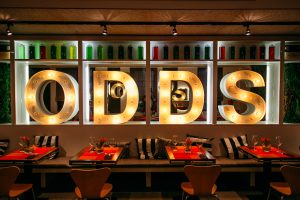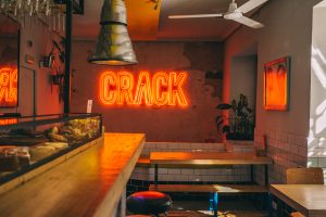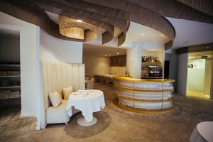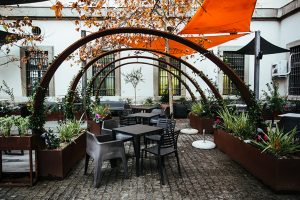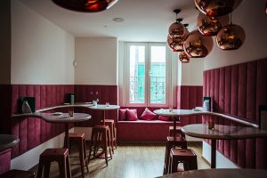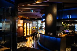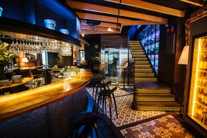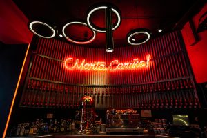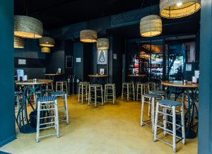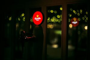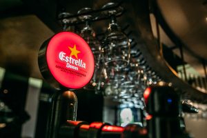 Fotografía de espacios gastronómicos reformados bajo la marca Estrella Damm en Madrid, mostrando integración de branding, arquitectura e interiorismo. Reportaje visual que destaca materiales, ambiente y relación entre diseño del espacio y experiencia de marca.